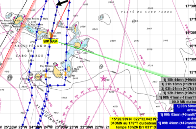 Pour le moment, tous les routages font passer entre les iles du Cap Vert. Chris a particulièrement étudié la question des dévents et on dirait qu'il y a une opportunité à saisir avec l'accélération autour de Fogo qui nous aidera à condition de bien positionner les sillages ... ça implique quelques gybes mais c'est mieux que de se retrouver dans du vent faible.