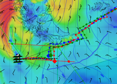 Le routage de base passe à l'Ouest. La route du milieu ne perd rien. La route Est fait perdre 50minutes. Mais les routages Ouest et milieu traverse le dévent trop facilement. On est OK pour manoeuvrer autant qu'il faudra. On ne veut juste pas se faire embarquer trop à l'Ouest par un dévent qu'on ne pourrait pas traverser une fois le choix fait.