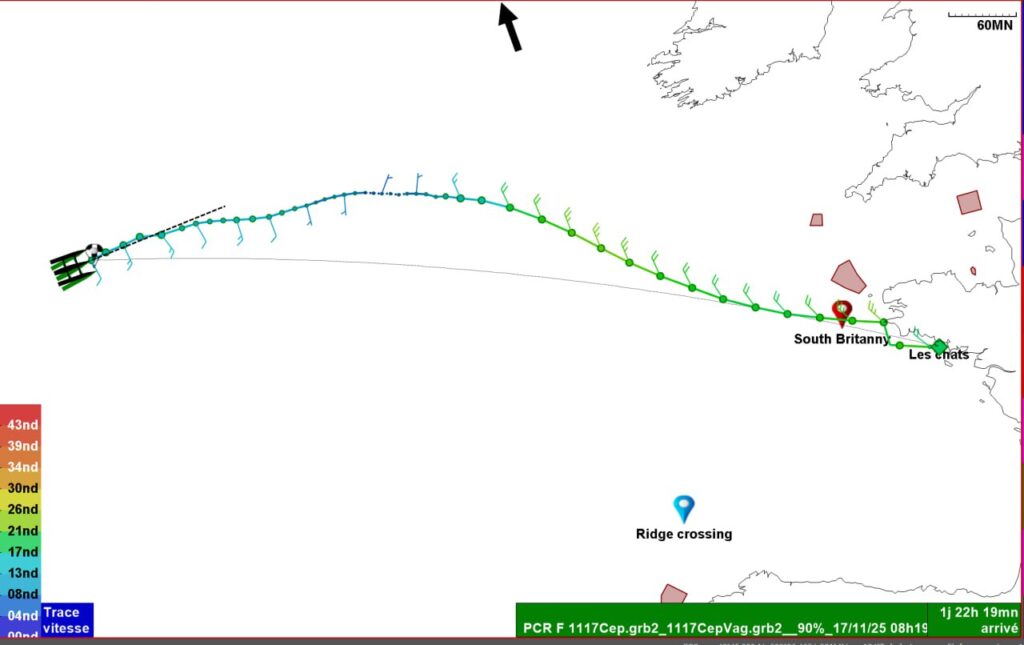 Bonjour à tous, ETA devant Lorient vers 22h ce soir pour le moment. A voir en fonction du vent que l'on trouve. Au moteur depuis milieu de nuit