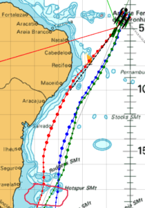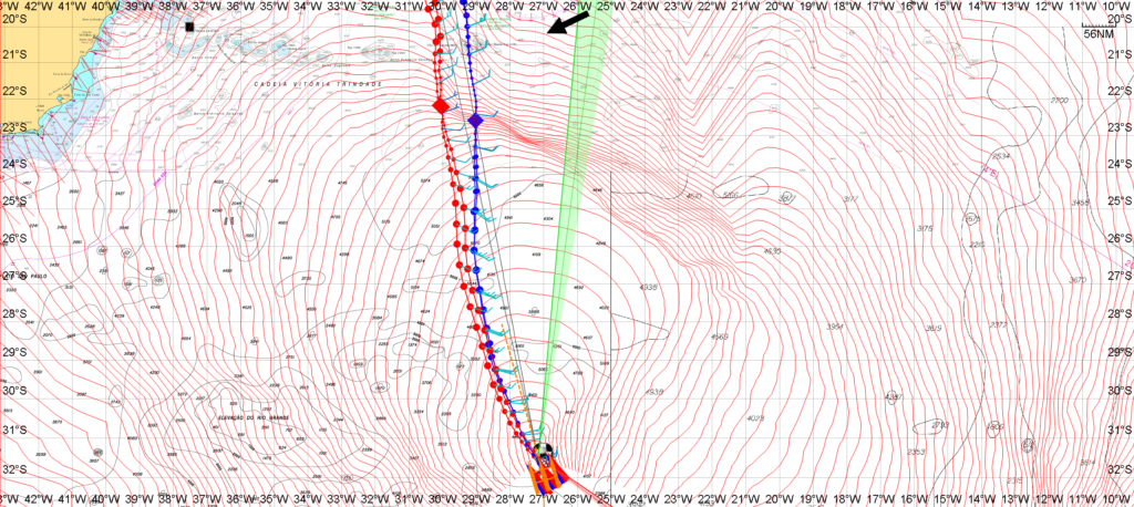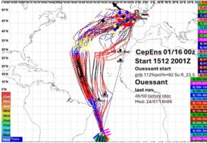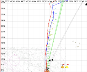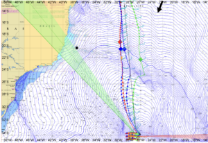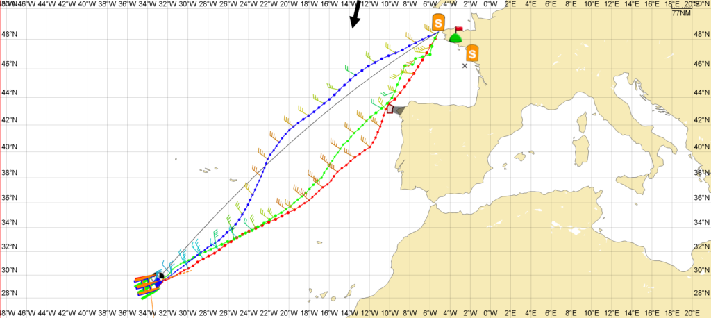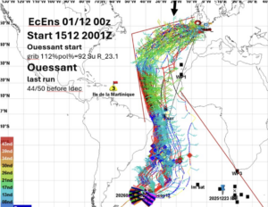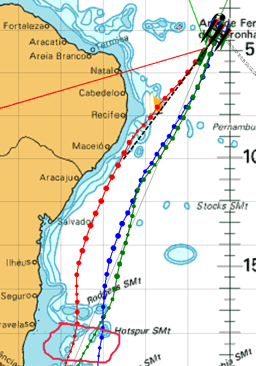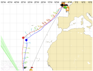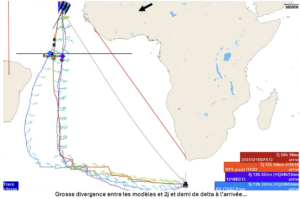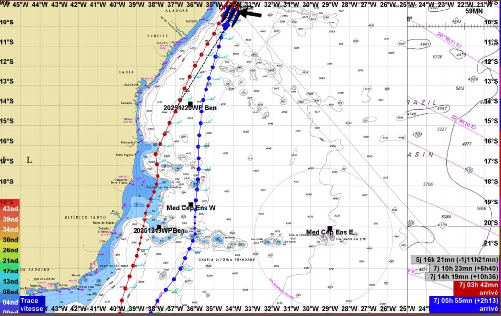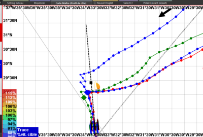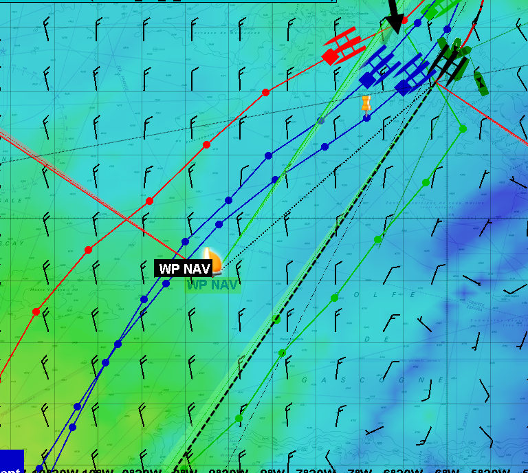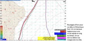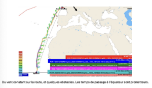 Pour le plus long terme, il faut savoir où placer le dernier gybe et définir comment on négocie le Cap Vert. Avez vous commencé à bosser sur le point d'entrée du Pot au Noir ? Si oui, quel est votre waypoint ? Pour le moment, on se base sur passage Equateur par 27.5W.