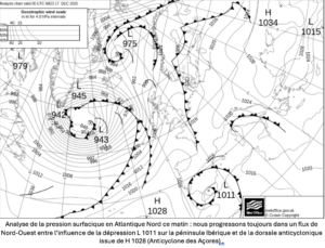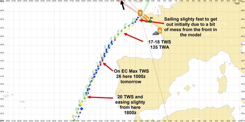Bonne cohérence entre les deux modèles sur la première portion. On partirait donc sur J0 dans un premier temps, une fois que le routage vous a sorti de toute l’influence perturbée du front. Je pense que c’est la bonne option pour démarrer avec le J0, à condition d’avoir une pression correcte. En descendant ensuite le long de la côte portugaise, le vent va se renforcer : le routage est légèrement réglé en mode rapide, tout en jouant avec la dorsale comme nous en avons parlé. À partir d’environ 18 UTC demain, la navigation devient franchement plus orientée VMG, au moment où l’on commence à préparer le contournement de l’anticyclone des Açores.