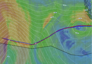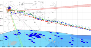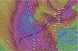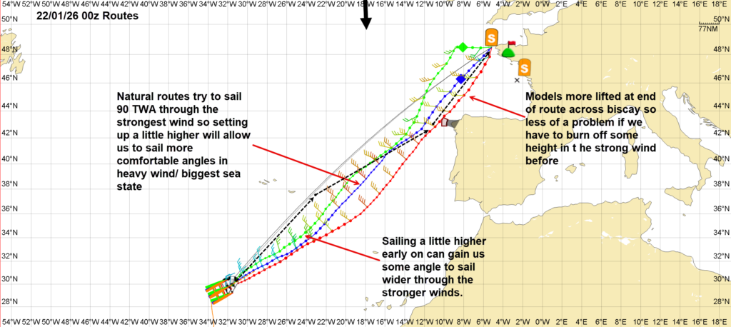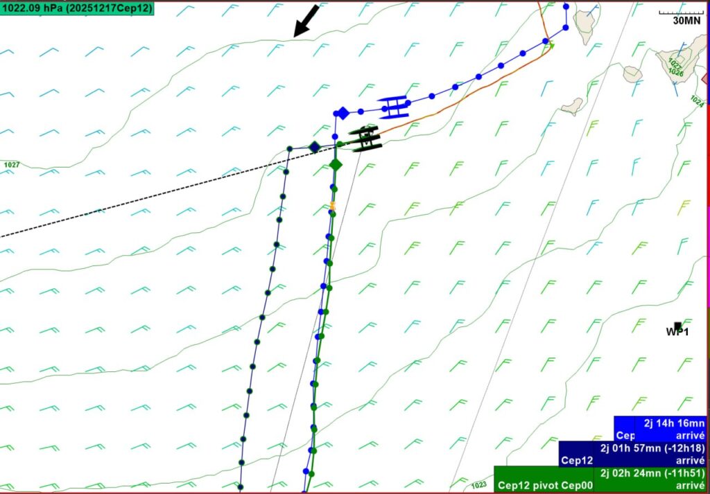 Les fichiers de 00z sont un peu plus en phase et notre timing est plus précis pour la gestion de la dépression. Le vent de NW de Vendredi est un peu plus à gauche et nous permet d'avoir une route un peu plus directe. Ceci-dit tous les routages choisissent de naviguer à 90°TWA dans la partie la plus forte. On est d'accord qu'un angle plus ouvert serait préférable donc on conseille d'investir en cap en sortie de dorsale pour être un peu au Nord des routages EC.