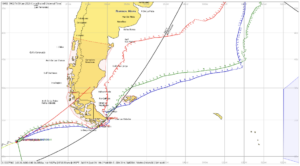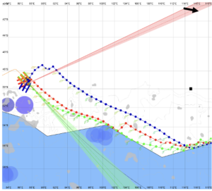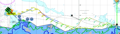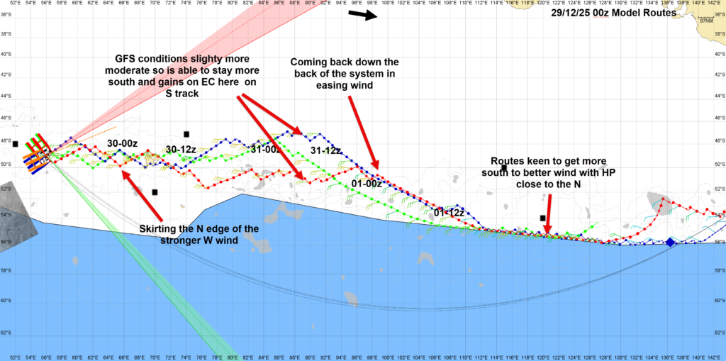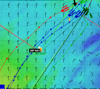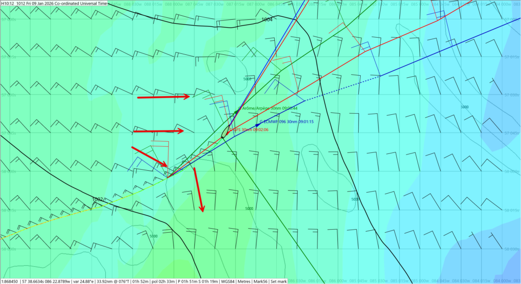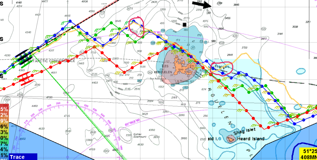 Le routage de base passe à l'Ouest. La route du milieu ne perd rien. La route Est fait perdre 50minutes. Mais les routages Ouest et milieu traverse le dévent trop facilement. On est OK pour manoeuvrer autant qu'il faudra. On ne veut juste pas se faire embarquer trop à l'Ouest par un dévent qu'on ne pourrait pas traverser une fois le choix fait.