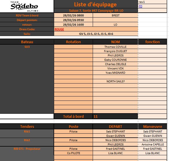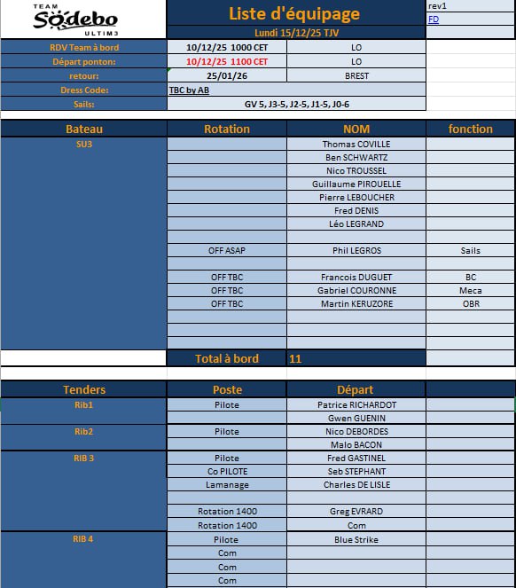Bonjour à tous, Update planning Nav/Tech MARDI 10: Nav technique, dock out 0900, dailygoals a suivre, objectif principal voiles et systemes. Merci de bien checker les tenders et matos remorquage, couteaux a poste pour tout le personnel naviguant. MERCREDI: Reserve nav si necessaire en fonction job list première nav. si bateau a quai Medical pour l'équipage le matin. VENDREDI: bateau a quai. Avitaillement et fin de préparation vie à bord. Pesée matos embarqué.