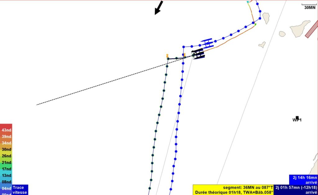 Tout nickel pour le moment. Un peu plus de vent et un bon décalage Est. Vous avez bien joué avec les shifts et vous semblez faire mieux que le routage.