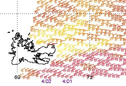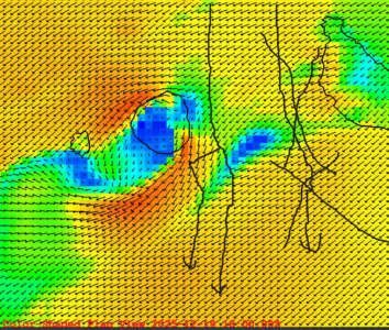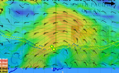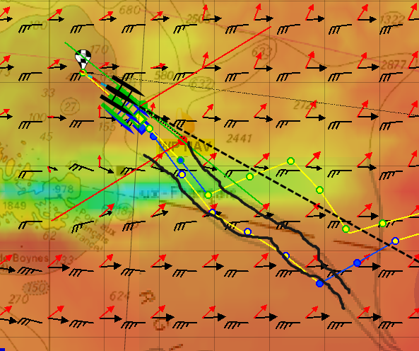 Il semblerait que ça va continuer d'adonner jusqu'à un max au 250° vers 16-17h TU, puis que ça refusera alors quand on entrera juste en avant du flux de Nord Ouest.