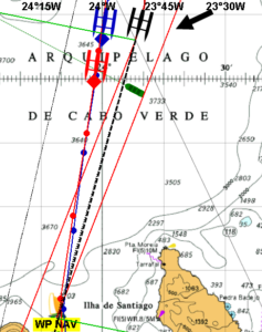 Pour le moment, tous les routages font passer entre les iles du Cap Vert. Chris a particulièrement étudié la question des dévents et on dirait qu'il y a une opportunité à saisir avec l'accélération autour de Fogo qui nous aidera à condition de bien positionner les sillages ... ça implique quelques gybes mais c'est mieux que de se retrouver dans du vent faible.
