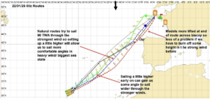 Avec ces routages, on ne peut pas totalement éviter les sillages. On va bosser à en limiter autant que possible l'impact en jouant sur la distance sous le vent et en les traversant avec le bon angle pour s'y exposer le moins possible.