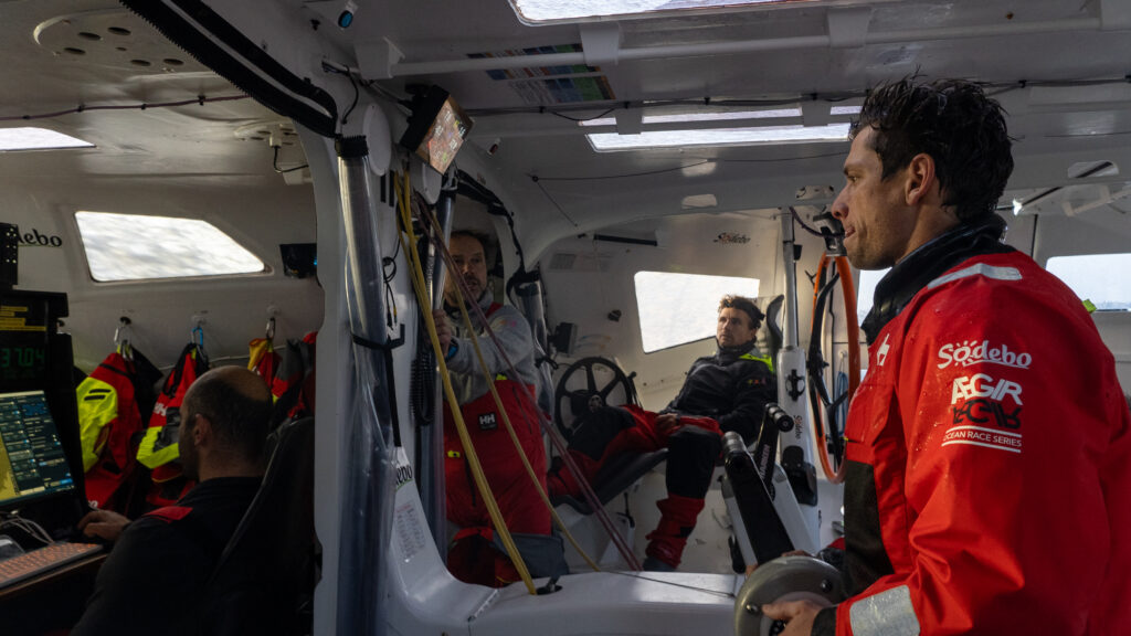 En regardant les gribs de 12z et en constatant le vent relativement moins fort depuis une heure, on pense être proches de la limite du vent le plus fort. On dirait aussi que ça s'évacue un peu plus rapidement que ce que disaient les gribs de 00z. On prévoit de faire encore une à deux heures comme ça avant de se caler sur un angle plus bas. Les vitesses des routages sont très lentes pour les prochaines heures et on est à peu près sûrs qu'on sera plus rapides.